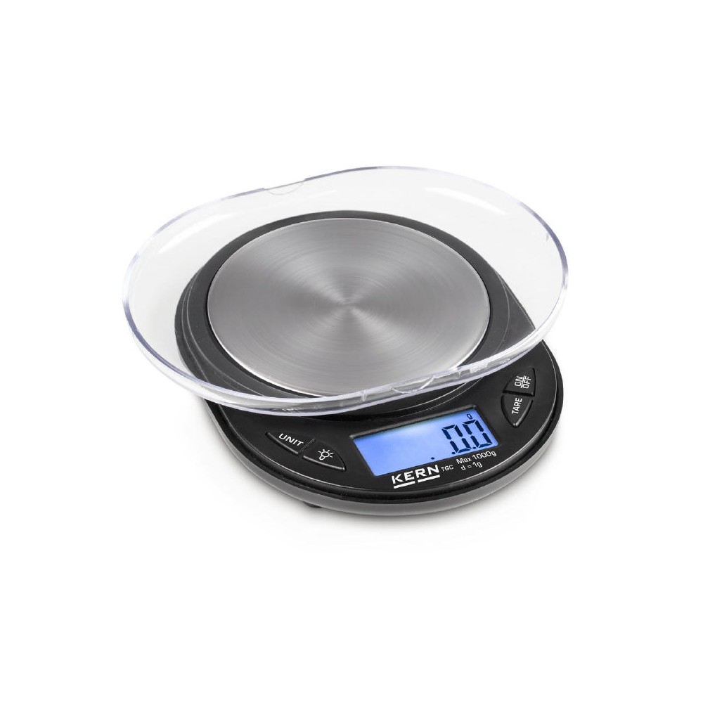 Wąska waga kieszonkowa z dużą płytką ważącą ze stali nierdzewnej i praktyczną szalką do tarowania.