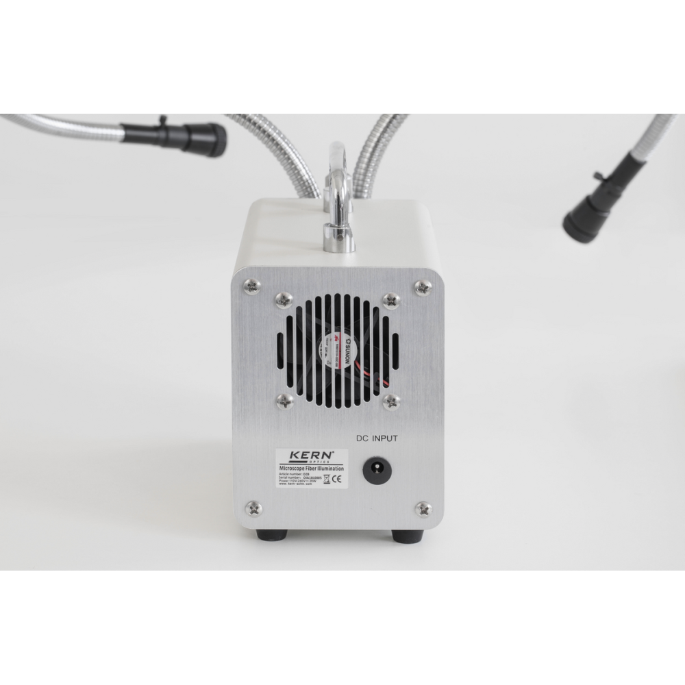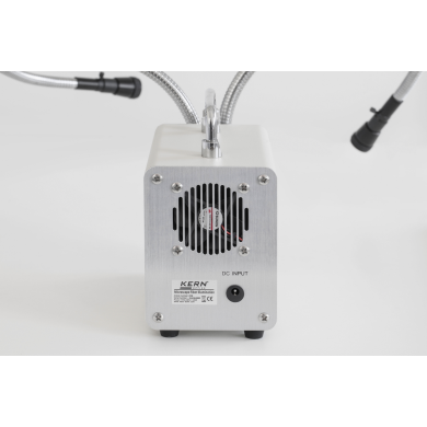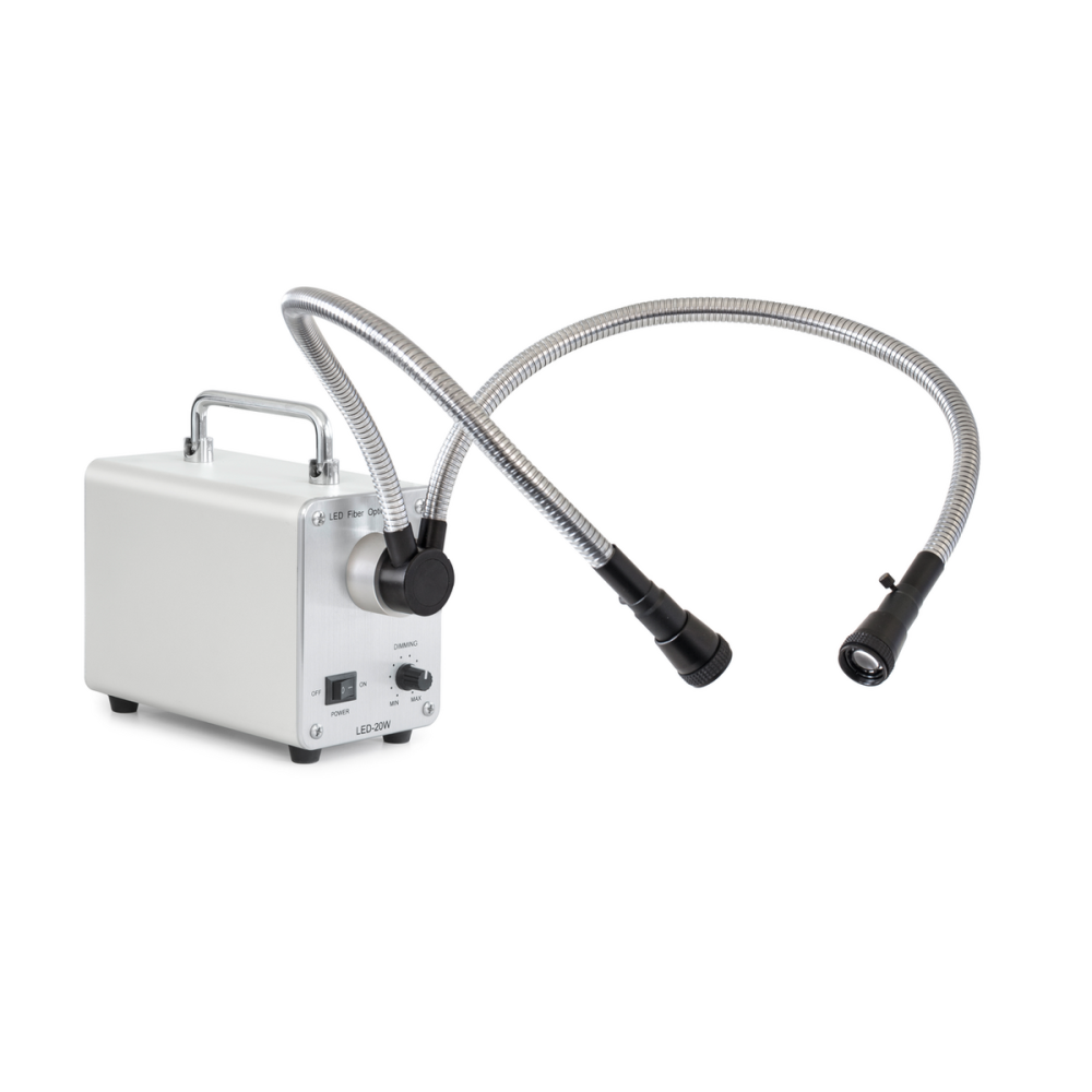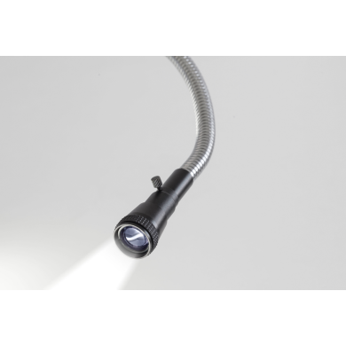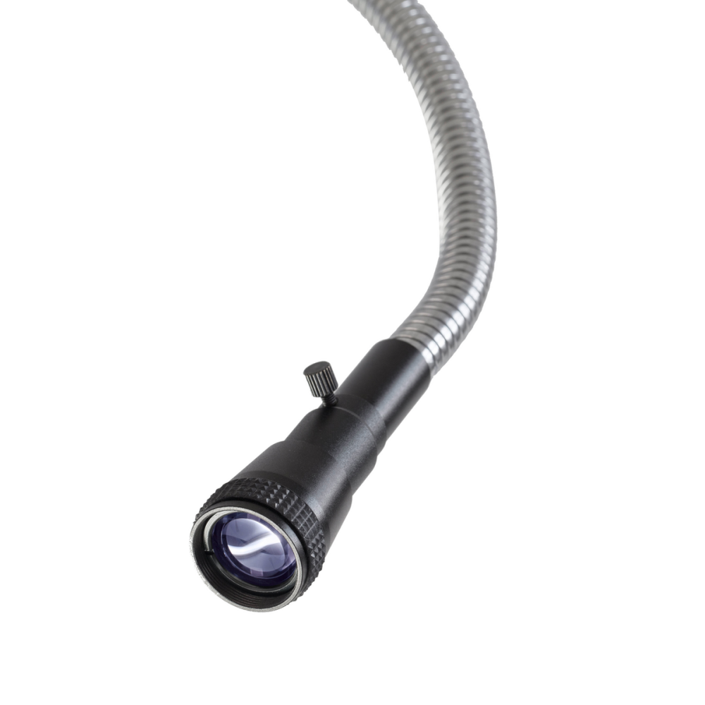 Podwójne, elastyczne ramiona typu „gooseneck” o długości 540 mm umożliwiają precyzyjne ustawienie kierunku światła, co jest kluczowe przy pracy z próbkami o nieregularnych kształtach lub wymagających selektywnego oświetlenia.