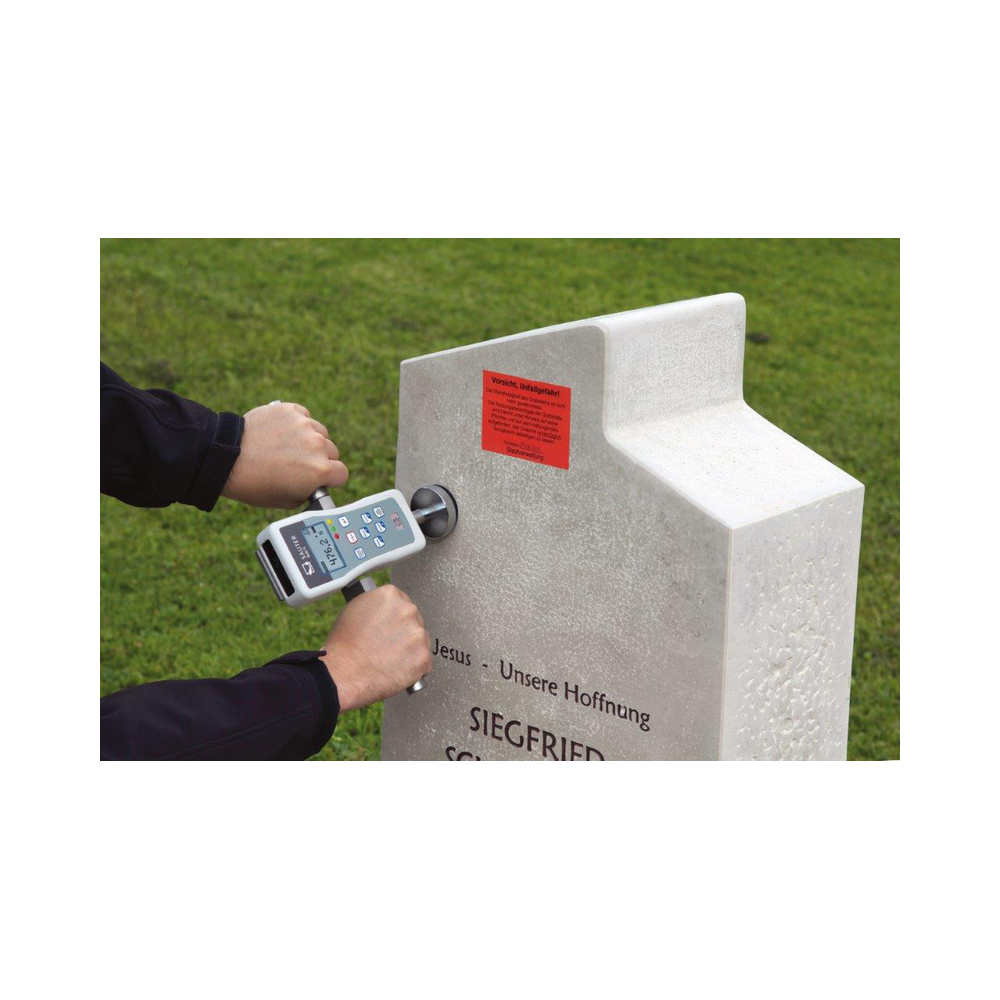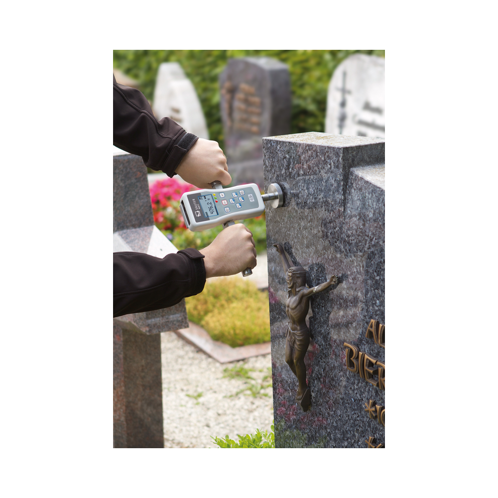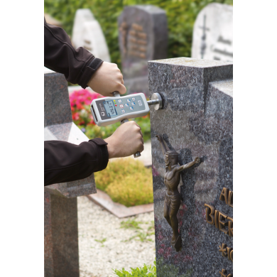 Szeroka płyta dociskowa pokryta powierzchnią z gumy piankowej zapobiega zarysowaniu nagrobka podczas przykładania siły. Funkcja ustawiania limitów pozwala na zaprogramowanie wartości granicznej stabilności. Gdy wartość ta zostanie przekroczona, urządzenie wyśle sygnał wizualny. Dzięki temu nie ma potrzeby ciągłego odczytywania wyniku pomiaru. |