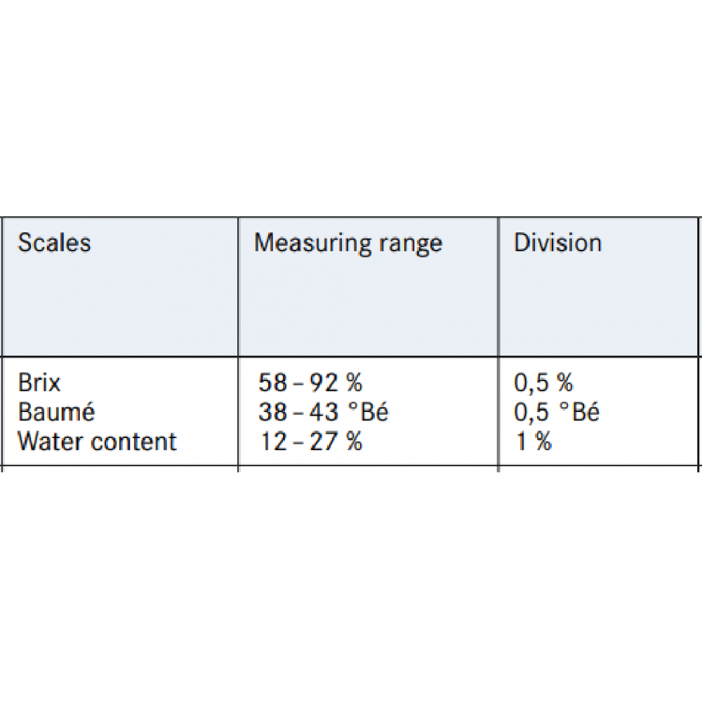 Modele są odpowiednie do pomiaru wartości Brixa, zawartości wody w miodzie i stopnia Baumé (°Bé) w celu określenia względnej gęstości cieczy.