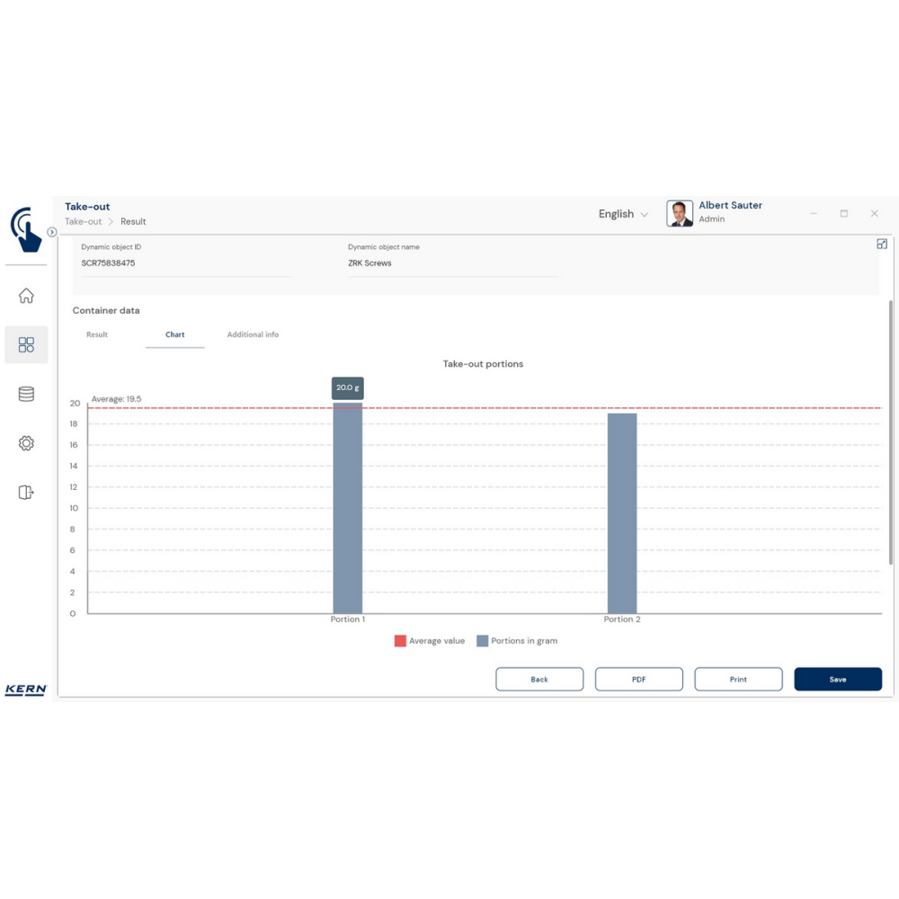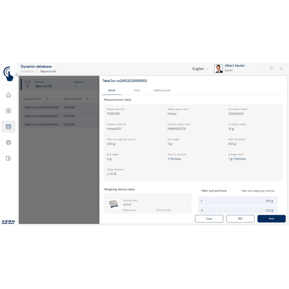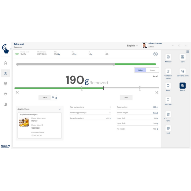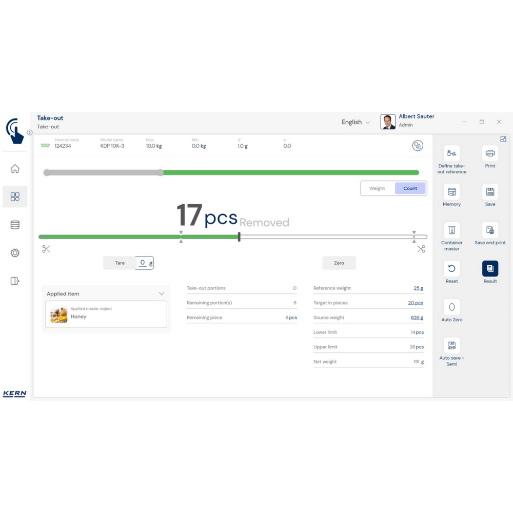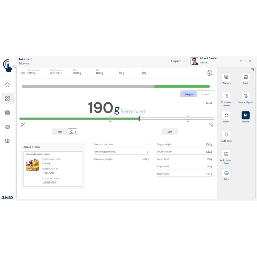 KERN EasyTouch SET‑08 to rozszerzenie bazowego programu SET‑01 Base, oferujące funkcję Take‑out, która umożliwia szybkie i precyzyjne wydzielanie porcji z pojemnika źródłowego metodą ważenia ujemnego.