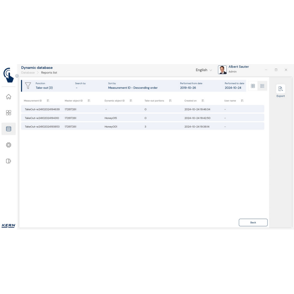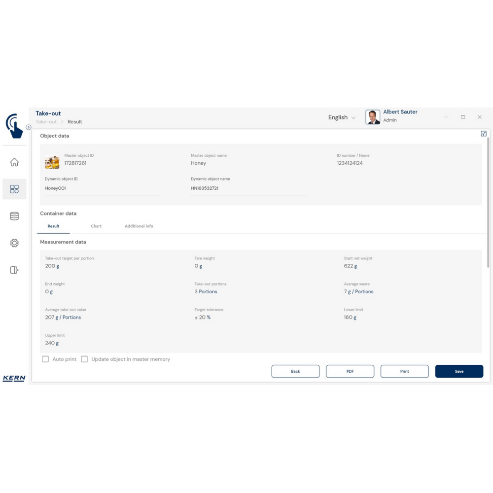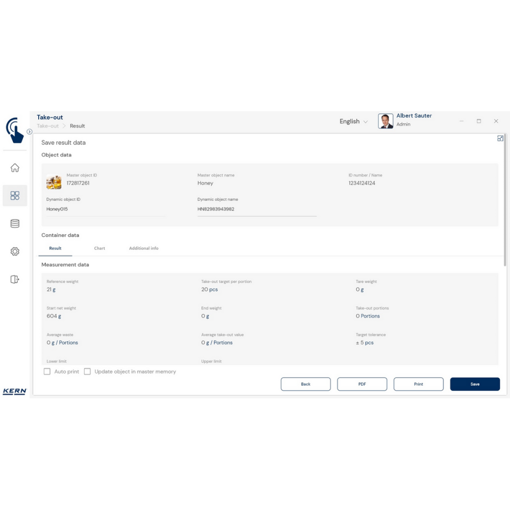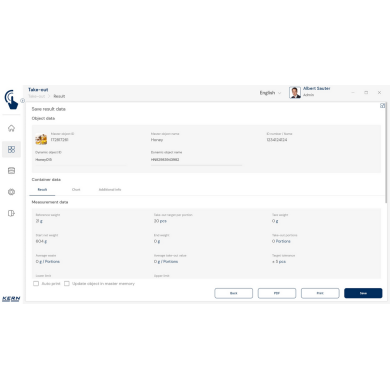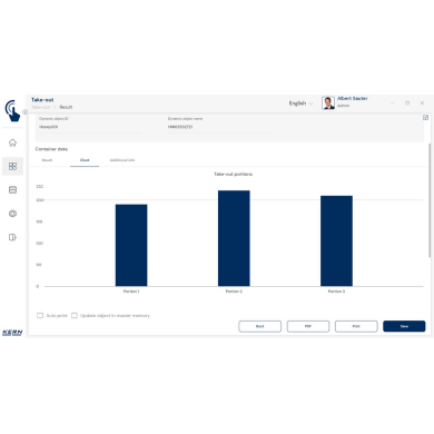 KERN EasyTouch SET‑08 to rozszerzenie bazowego programu SET‑01 Base, oferujące funkcję Take‑out, która umożliwia szybkie i precyzyjne wydzielanie porcji z pojemnika źródłowego metodą ważenia ujemnego.