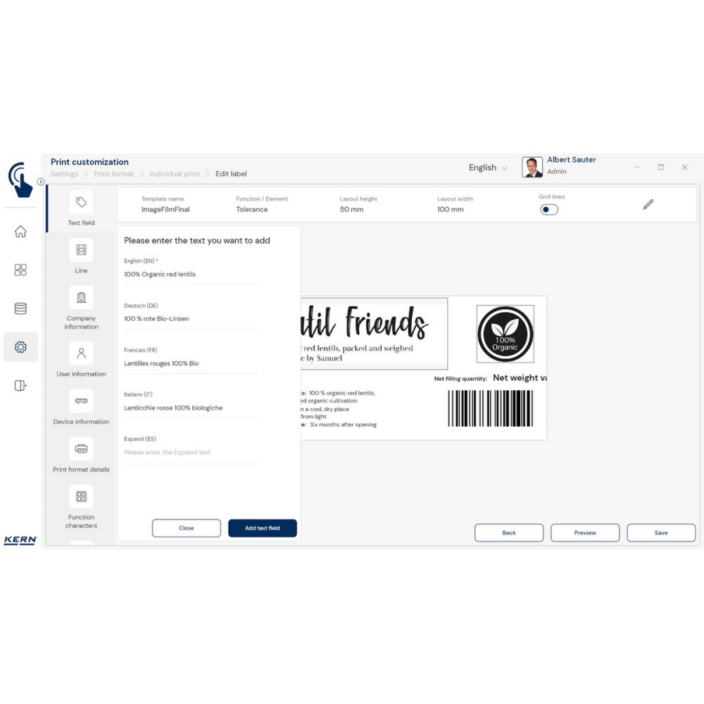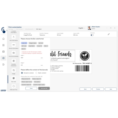 Profesjonalny moduł KERN EasyTouch SET‑14 umożliwia pełną personalizację wydruków z wag i systemów KERN – od układu elementów, przez format etykiet, po kody kreskowe i logotypy. Idealny dla firm, które cenią estetykę, czytelność i spójny wizerunek marki.