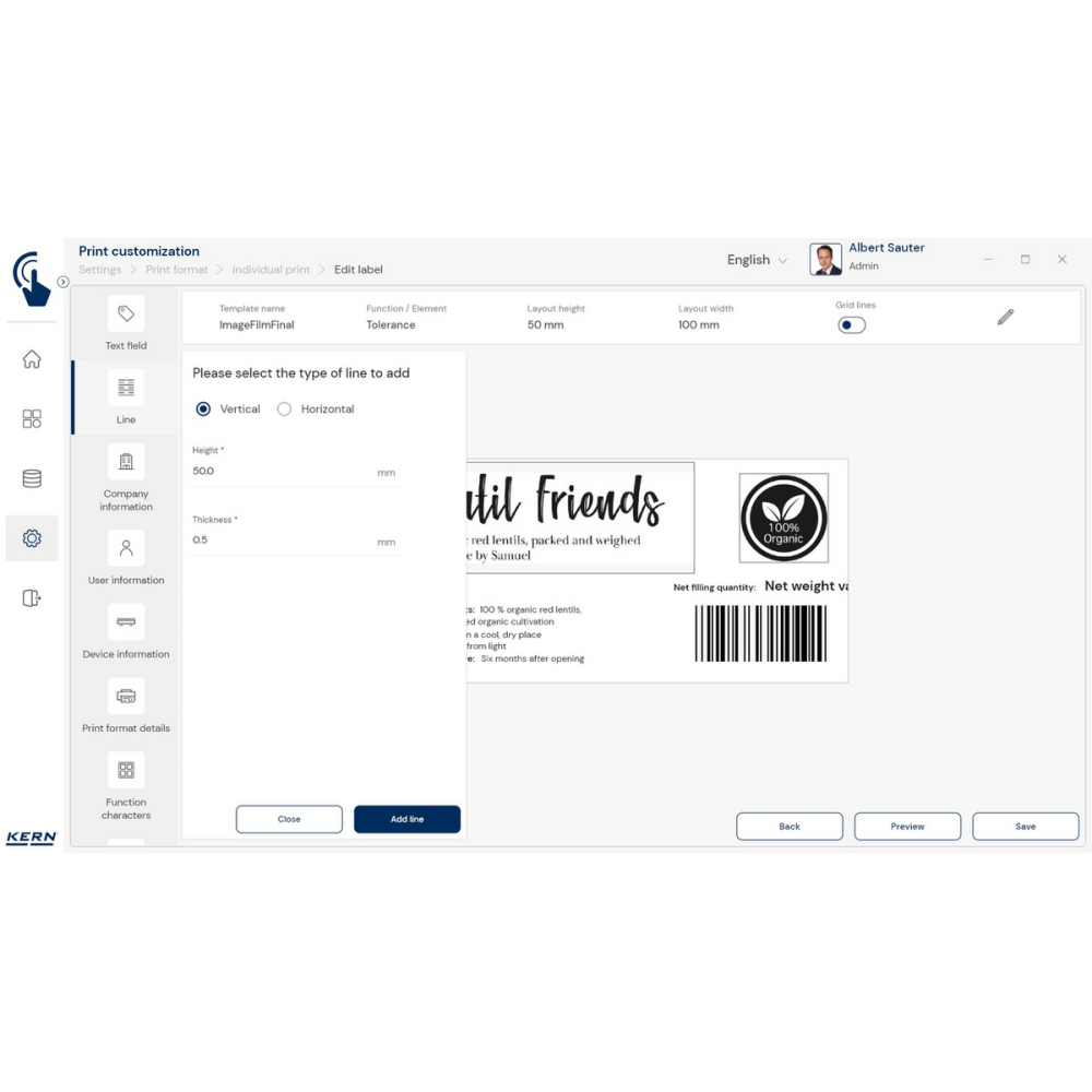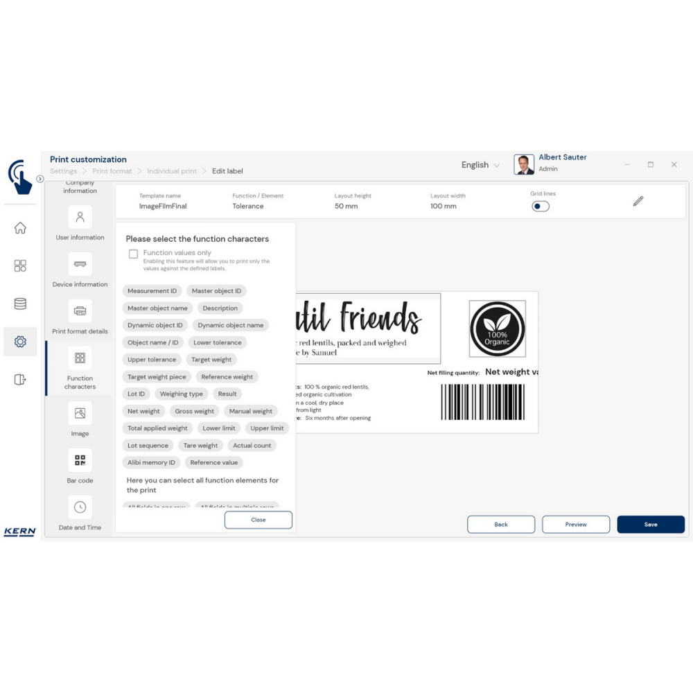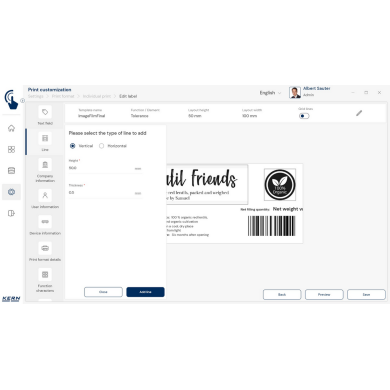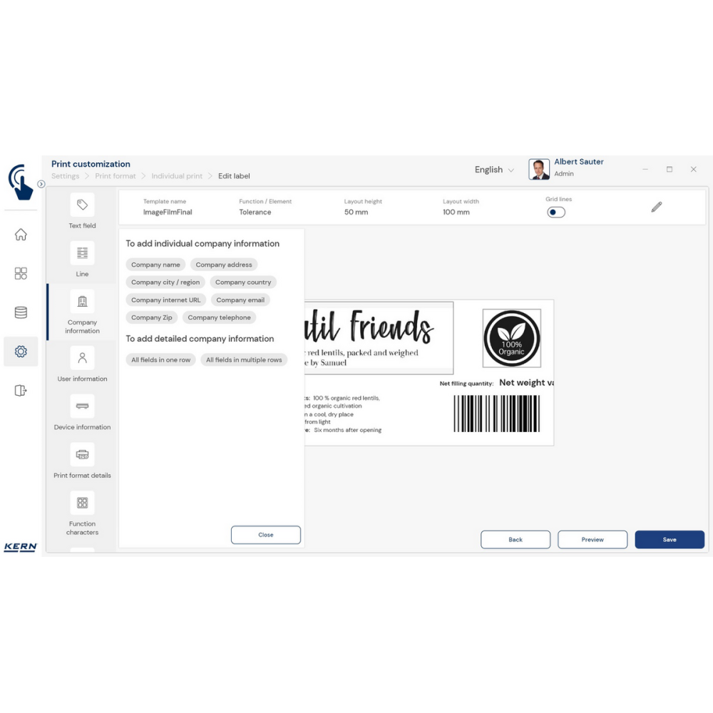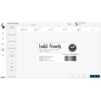 KERN EasyTouch SET-14 to zaawansowany moduł oprogramowania, który rozszerza możliwości podstawowej wersji KERN EasyTouch SET-01 Base o funkcję Individual Print – personalizowanych wydruków. Dzięki niemu możesz w prosty i szybki sposób zaprojektować etykiety oraz dokumenty idealnie dopasowane do potrzeb Twojej firmy.