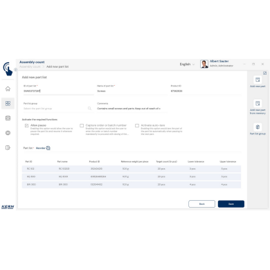 Moduł KERN EasyTouch SET-35 to profesjonalne narzędzie dla firm, które chcą usprawnić proces kompletacji zamówień, montażu zestawów i kontroli jakości. Funkcja Assembly Count pozwala przypisać do każdego elementu listy części ilość docelową oraz tolerancję, a następnie – przy użyciu wagi – zweryfikować zgodność z tymi wartościami.