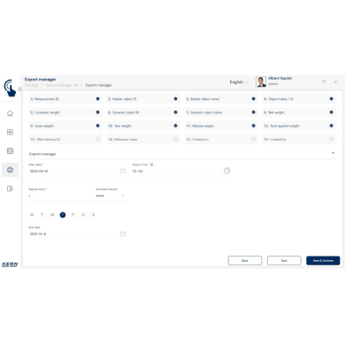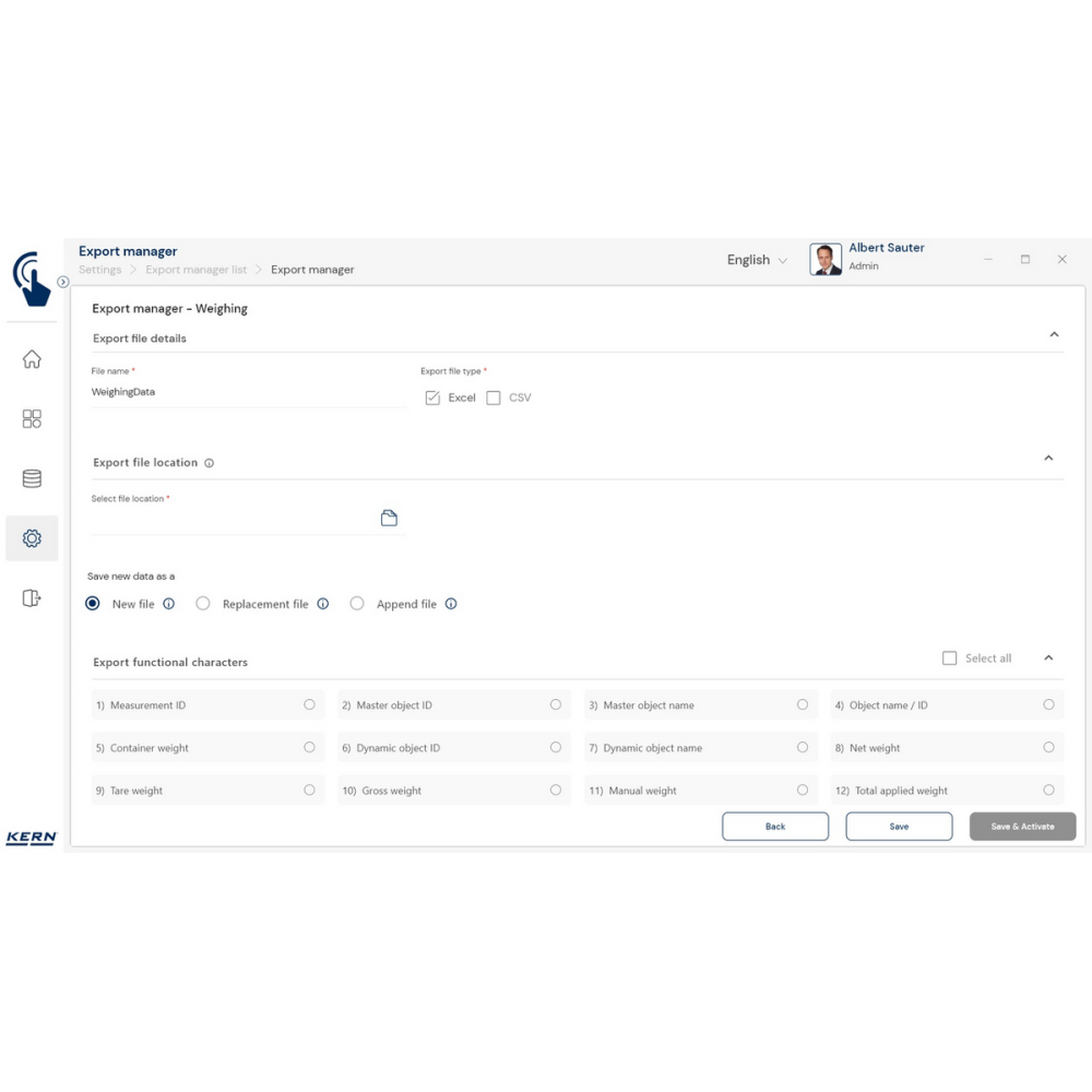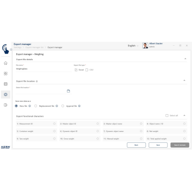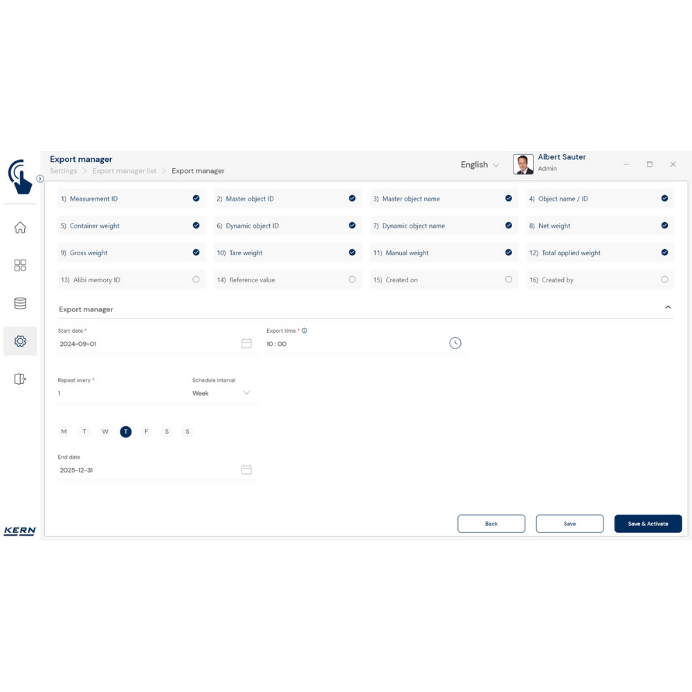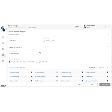 KERN EasyTouch SET-37 – moduł Export Manager do automatycznego eksportu danych z wag KERN w formatach CSV/XLSX, z harmonogramem, historią plików i integracją z SaveServer.