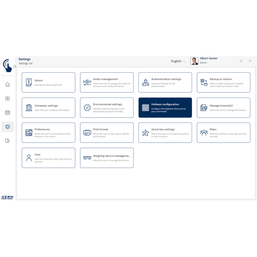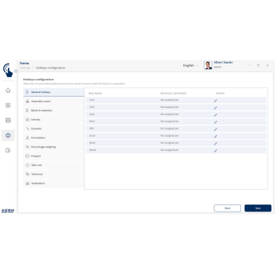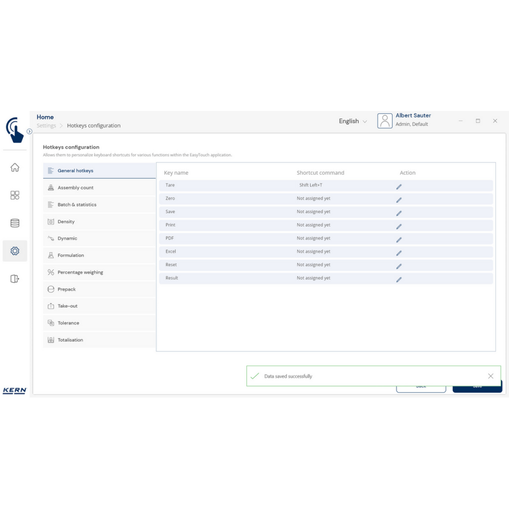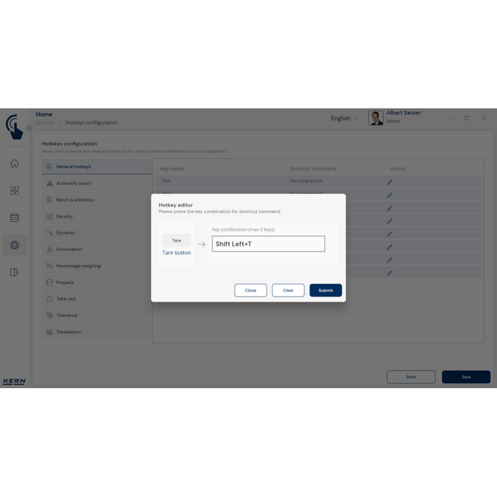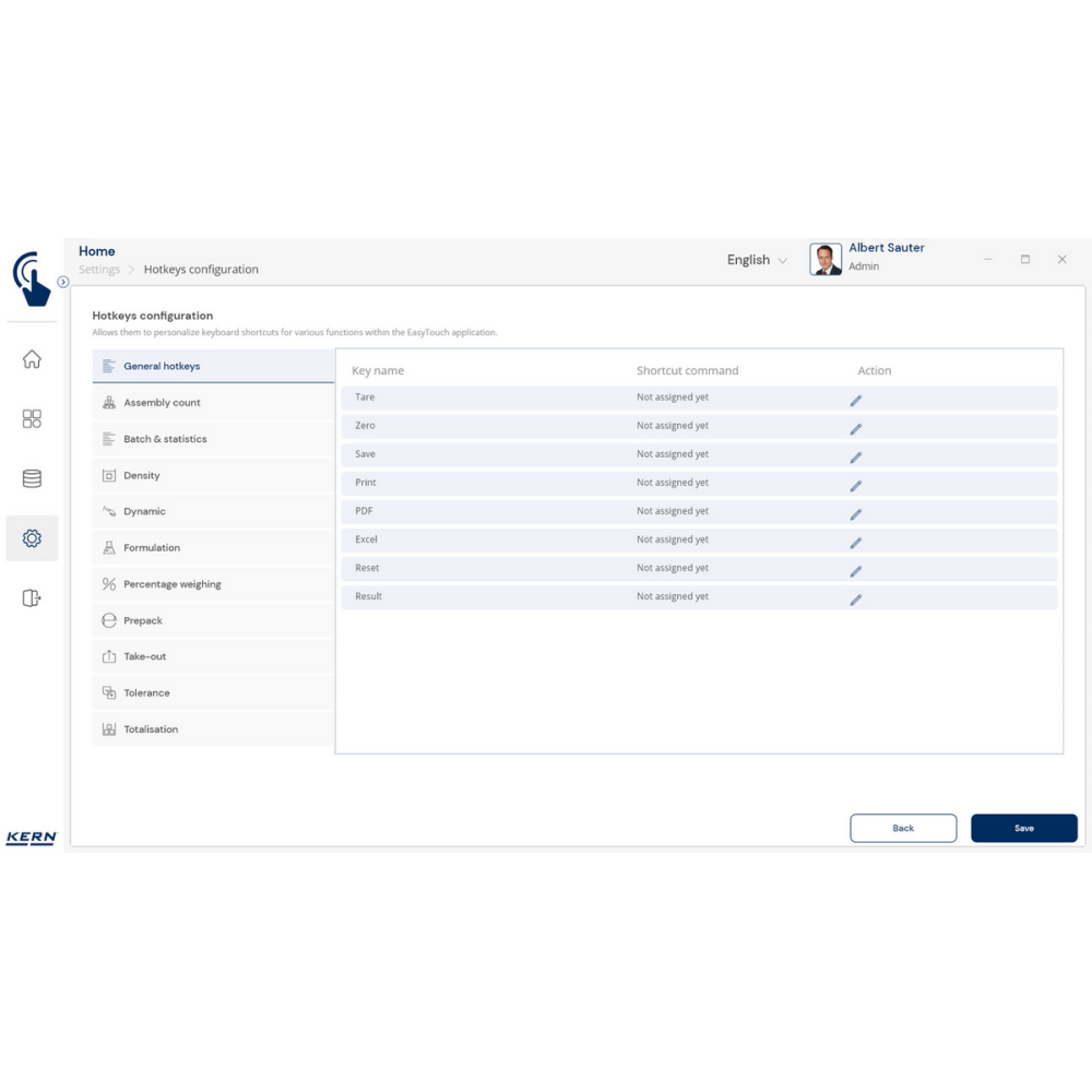 KERN EasyTouch SET-411 to profesjonalne narzędzie dla firm korzystających z wag przemysłowych EasyTouch, które stawiają na szybkość, ergonomię i bezpieczeństwo pracy. Funkcja Hotkeys pozwala przypisać kombinacje klawiszy do dowolnych przycisków i funkcji w oprogramowaniu — od prostych poleceń, takich jak „Zapisz” czy „Tara”, po specjalne funkcje w konkretnych modułach.