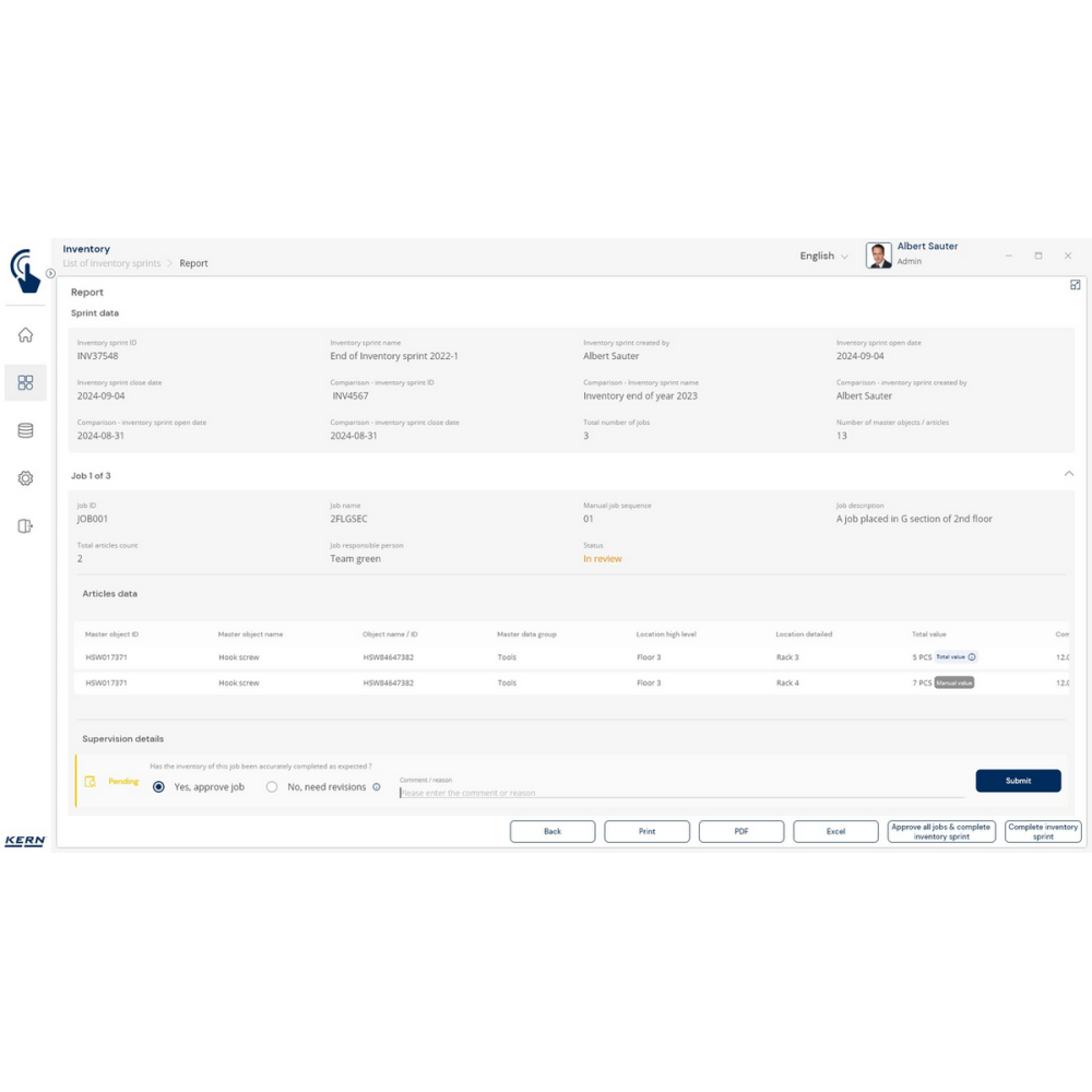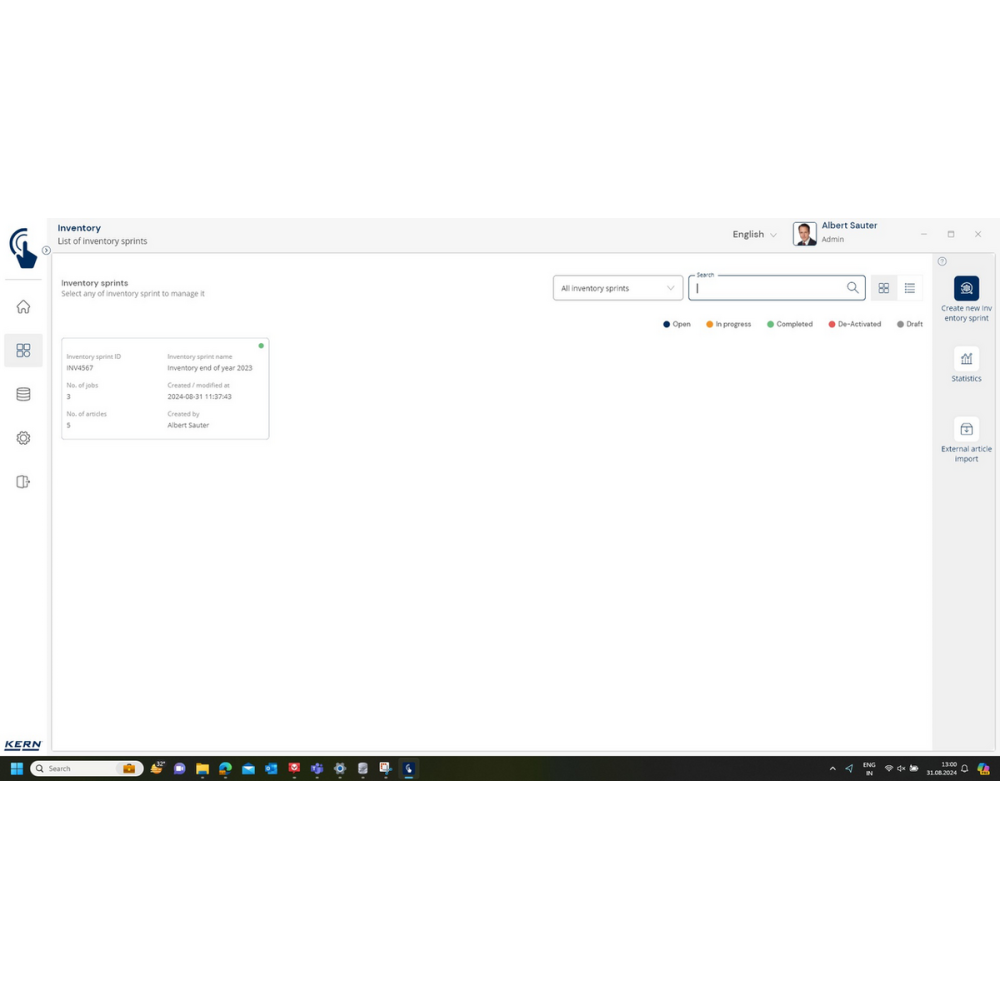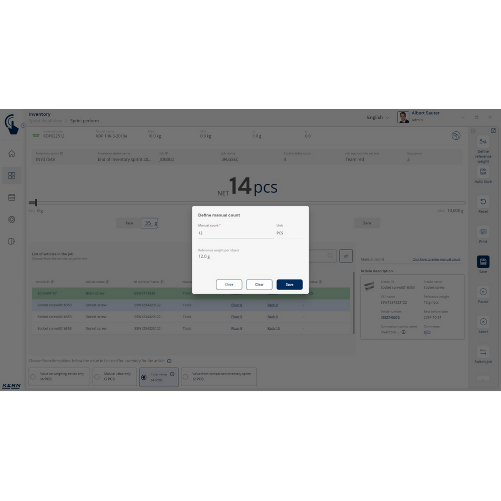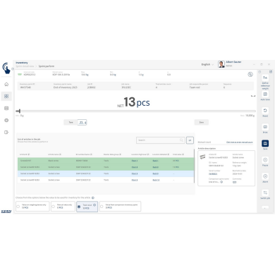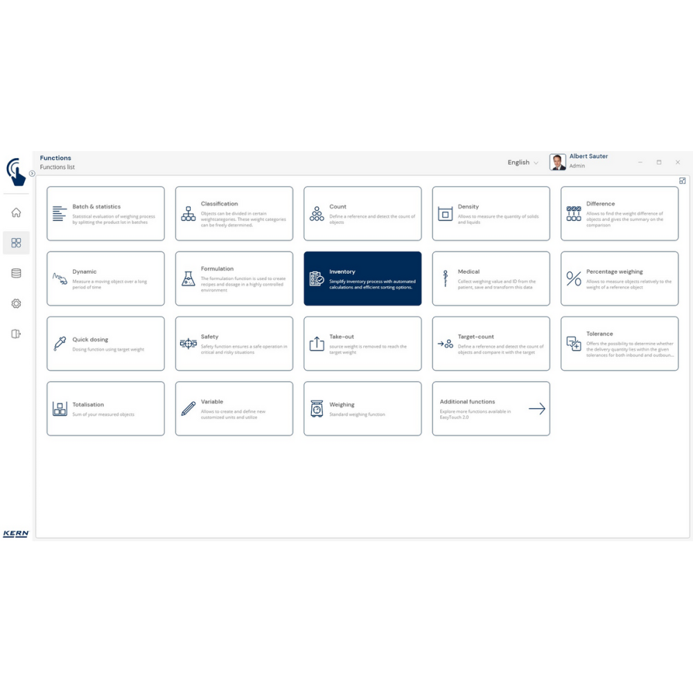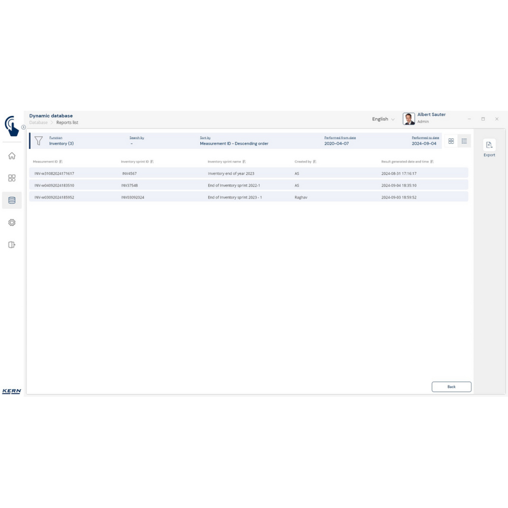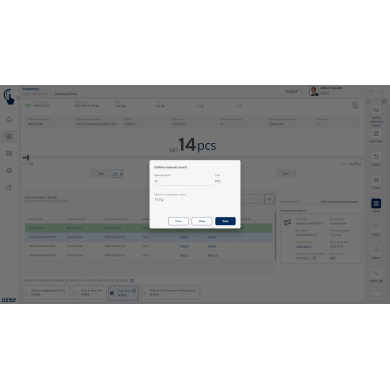 KERN EasyTouch SET-52 Inventory to moduł i baza danych, które umożliwiają szybkie, precyzyjne i bezbłędne przeprowadzanie inwentaryzacji. Wystarczy skan kodu kreskowego i ważenie produktu, a system automatycznie policzy sztuki, zapisze wyniki i przygotuje kompletną listę towarów.