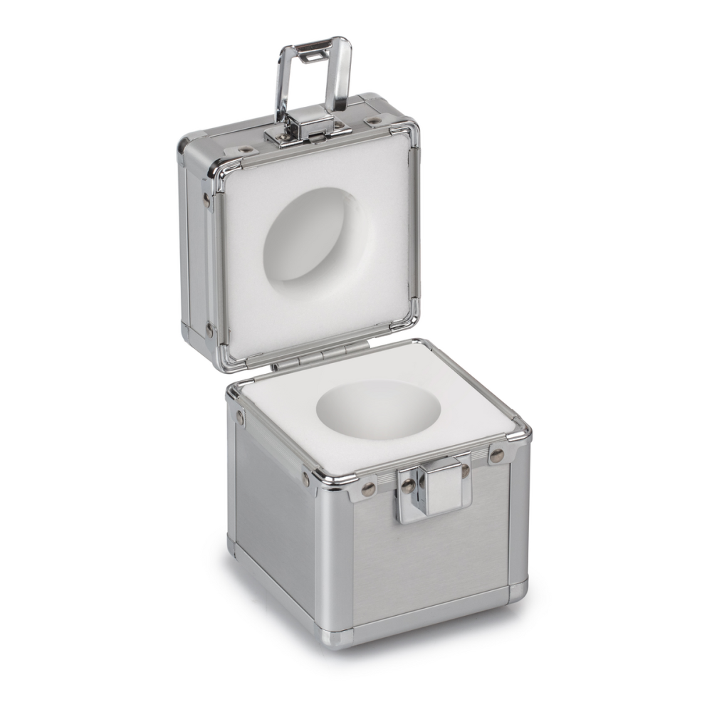 Aluminiowe pudełko ochronne do odważnika 1 g (OIML E1–M3) z dopasowaniem do kształtu cylindrycznego/kompaktowego.